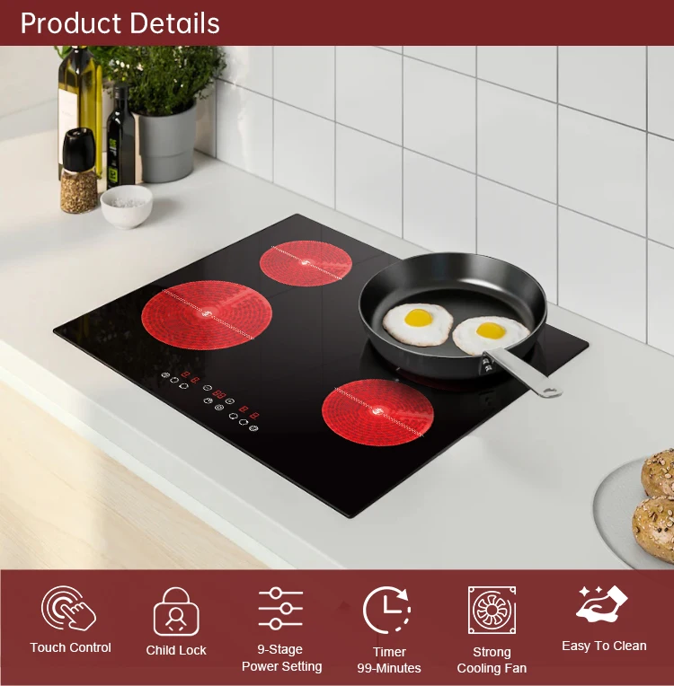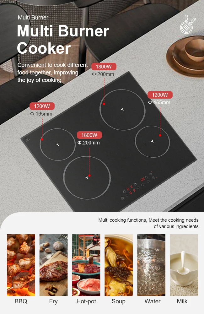 | Function | Four hobs/ Touch Control/ 9 power stage /Booster Function,Child Lock/,Residucl heat indicators/,Automatic safety switch off/,Pansor/,Timer |