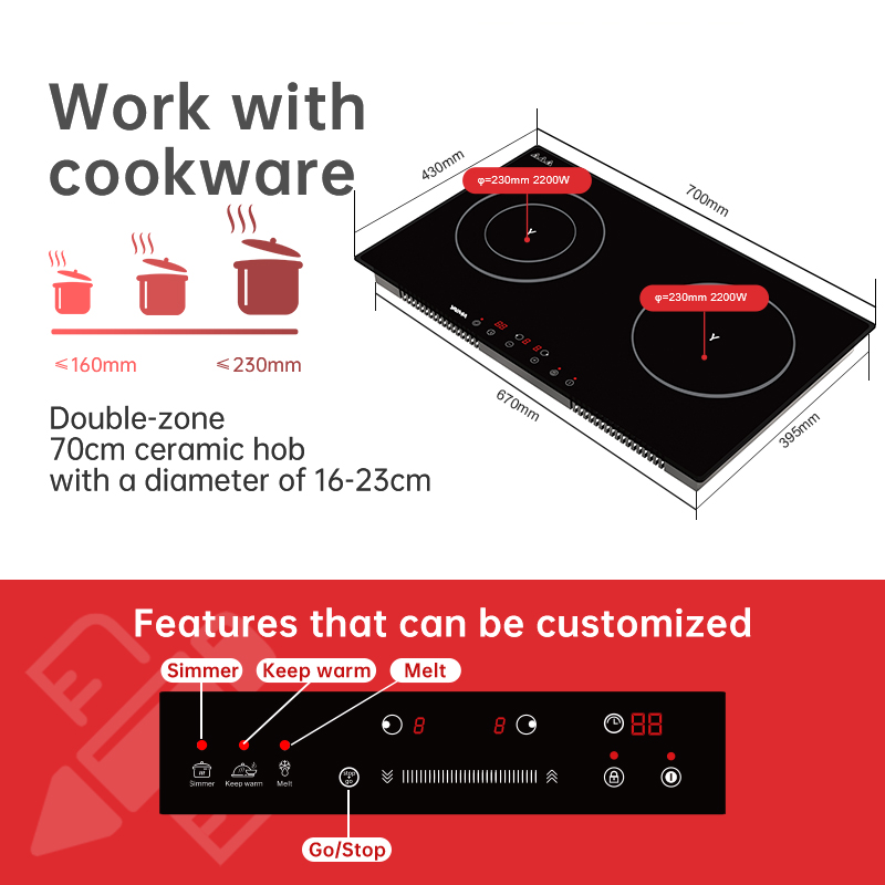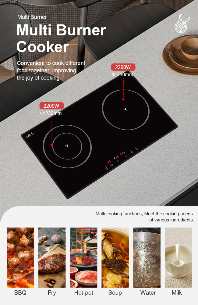 | Supply Voltage | Two hobs/ Touch Control/ /Timer/,Pansor/,Automatic safety switch off/,Residucl heat indicators/,Child Lock/,Booster Function220v |